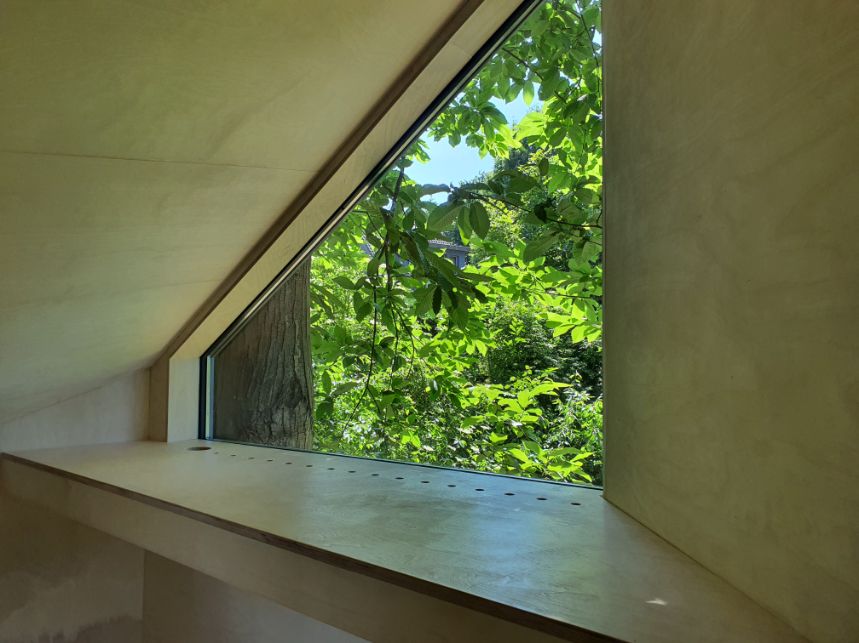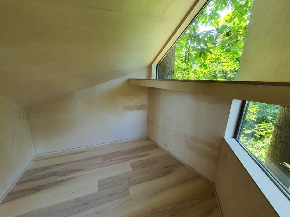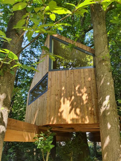 Boomhutje dat werd gebouwd als extra logeerkamer. Deze moderne boomhut biedt een aangenaam plekje om even tot rust te komen in het groen. Met leesplekjes voor elk weer. Een mezzanine voor het raam in de boomhut met prachtig uitzicht zodat je ook bij minder weer even kan relaxen en een bankje op het terras bij zonnig weer.