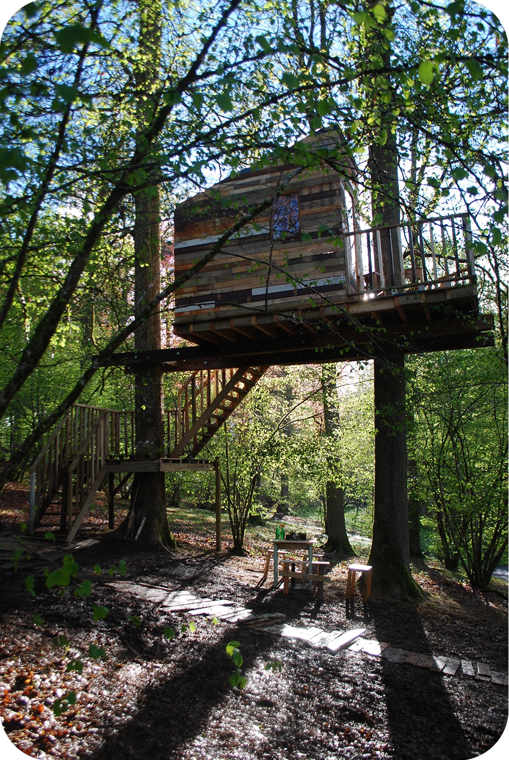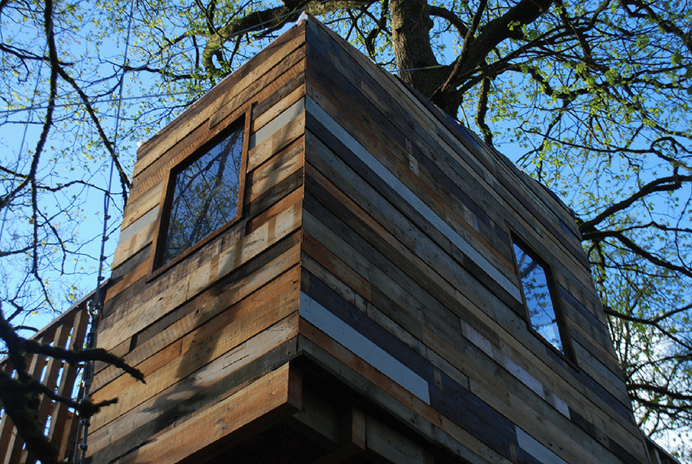 Deze boomhut werd speciaal gebouwd voor het festival Passion Robinson in het provinciaal domein van Chevetogne. Bezoekers konden de boomhut beklimmen en genieten van de sfeer en het uitzicht. Een echt succes. Deze boomhut werd op de grote constructiebalken na volledig uit recuperatiemateriaal gemaakt, wat en mooi kleurenspel oplevert. De boomhut werd volledig ‘opgehangen’ aan staalkabels hoog in de grote vorken van de 2 stevige eikenbomen. Een zwevende boomhut dus!