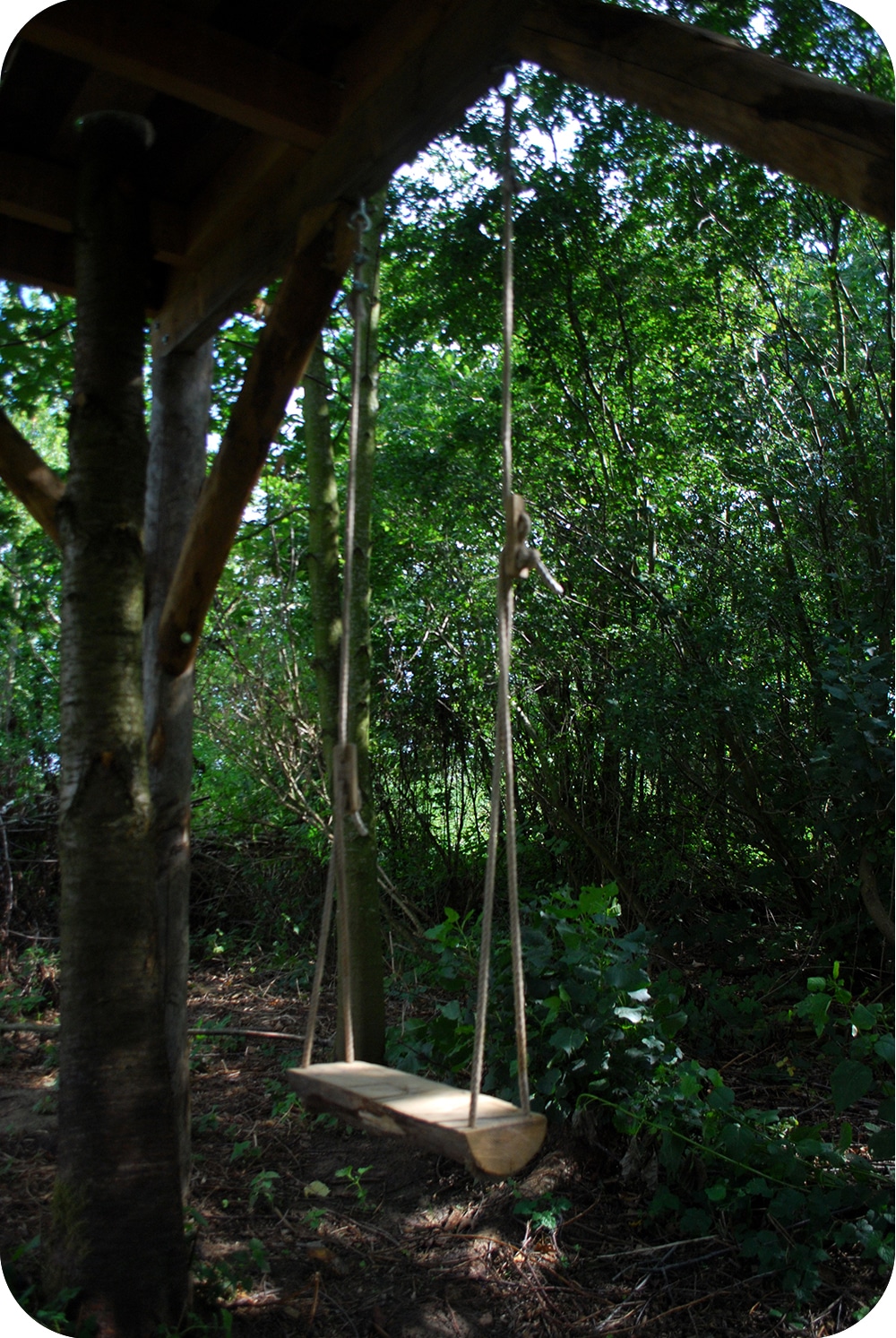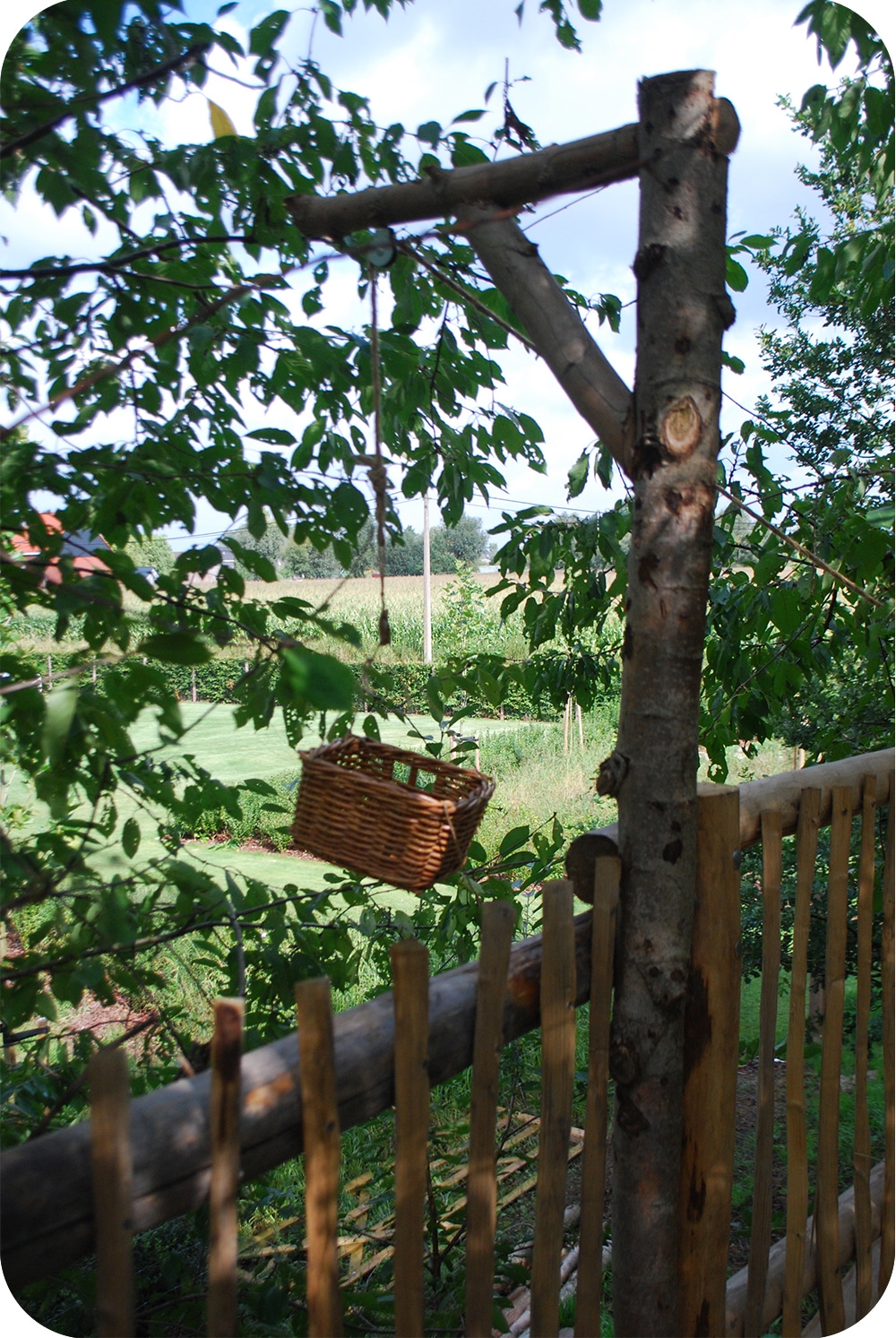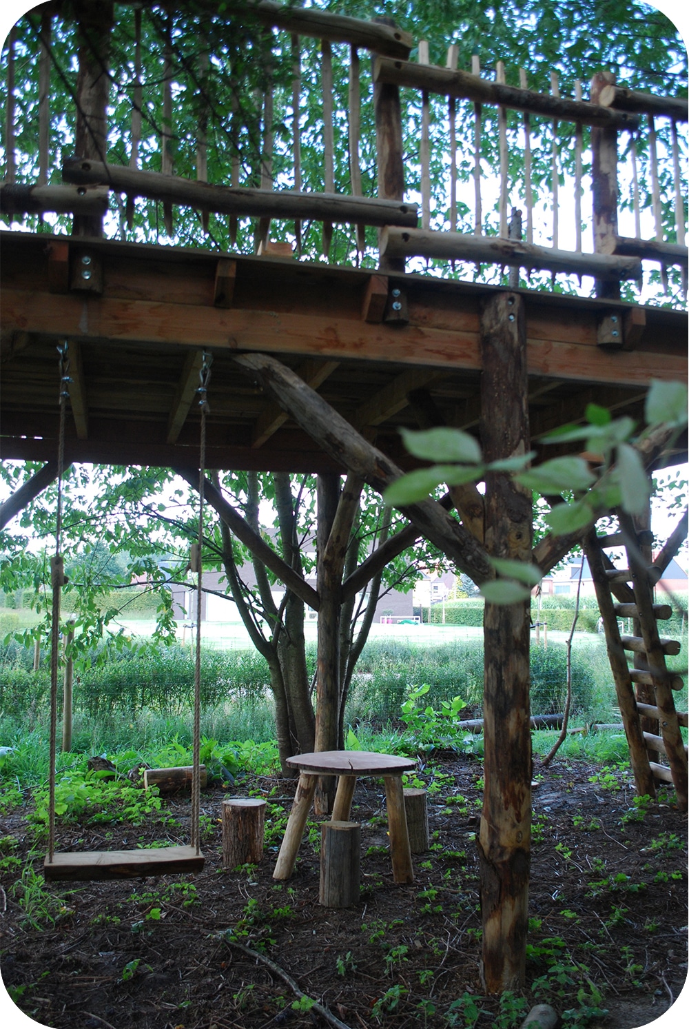 Achter in de tuin, verscholen tussen de bladeren schuilt een terras op hoogte met toegangsluikje en katrol om de picknick naar boven te hijsen. Ook onderin kan er volop gespeeld worden op de schommels of rond het boomstamtafeltje.